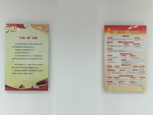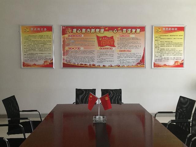 黨員活動室在醒目位置特設主題教育墻,包括黨旗、入黨誓詞、黨員義務和權利。活動室內有8個宣傳展版,內容包括組織架構圖、黨委委員崗位職責、紀委委員崗位職責、民主生活會組織生活會制度、“三會一課”制度、民主評議黨員制度、發展黨員工作流程圖和黨員活動日制度。活動室還配備了報刊書架,擺放黨員學習書刊雜志等。